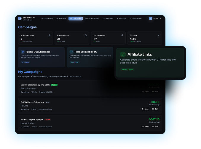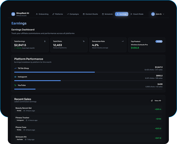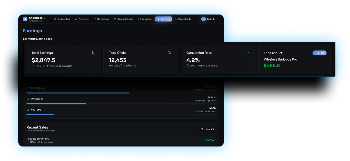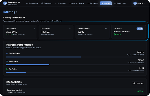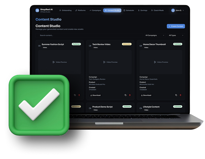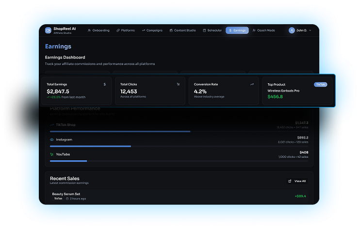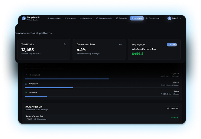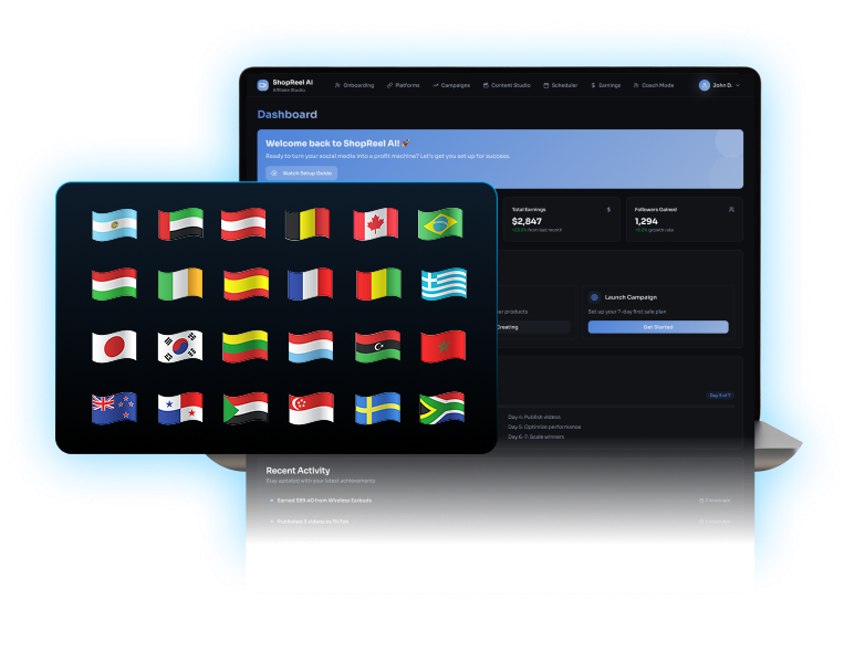 Works anywhere in the world. If TikTok Shop isn't available in your country, ShopReel AI automatically routes you to YouTube Shopping and Instagram affiliate programs instead. You're never locked out—the system adapts to your region and shows you exactly where you can earn today.