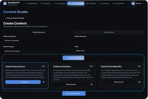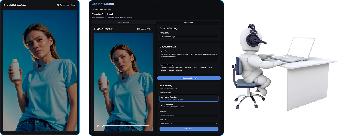 Immediately, ShopReel AI starts generating professional videos—complete with scripts, B-roll, captions, hashtags, and affiliate links. 10 videos per day, every day, without you lifting a finger.