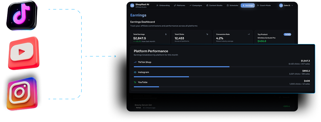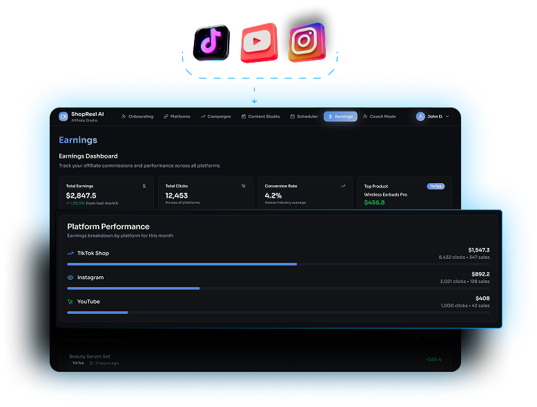 One video, three income streams. Connect your TikTok, Instagram, and YouTube accounts once. ShopReel AI automatically reformats and posts your content to all three platforms simultaneously. Triple your reach and triple your commission potential with zero extra work.