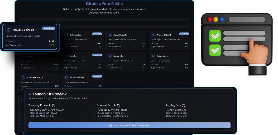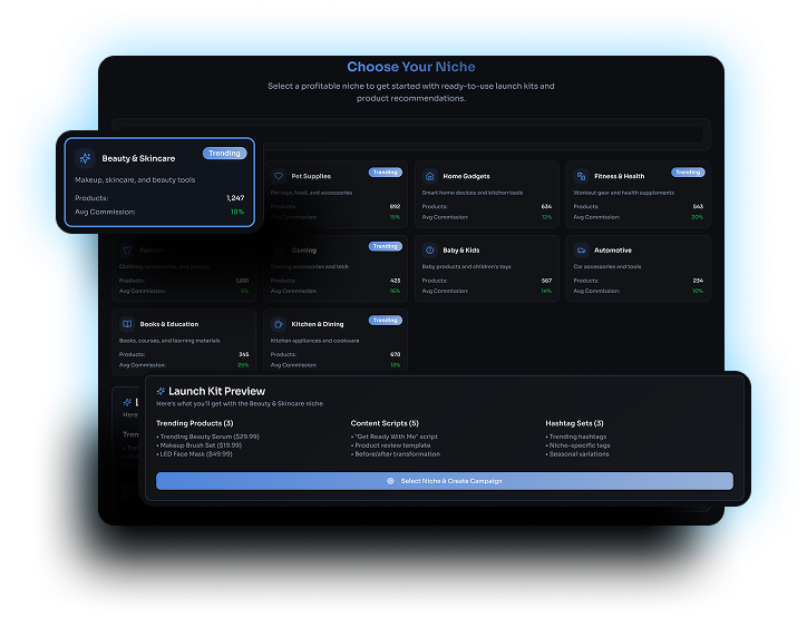 Don't waste time choosing a niche. Start with our battle-tested categories: Beauty, Pets, Home Gadgets, Fitness, Tech, Mom & Baby, Fashion, Kitchen, Outdoor, and more. Each comes pre-loaded with trending products and ready-to-use scripts so you can launch Day 1.