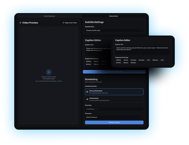 The caption can make or break your video's reach. AI generates platform-specific captions optimized for each algorithm—TikTok gets one style, Instagram another, YouTube a third. Includes researched hashtags, emoji placement, and CTAs that convert browsers into buyers without sounding salesy.