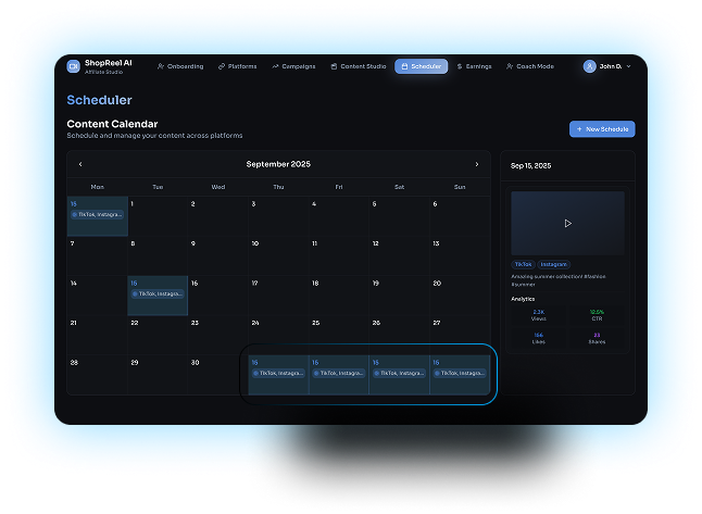 Consistency kills the competition. Queue up to 300 videos per month across TikTok, Instagram Reels, and YouTube Shorts. Set your posting schedule once (morning, afternoon, evening) and ShopReel AI handles the rest. Your content calendar fills itself while you sleep.